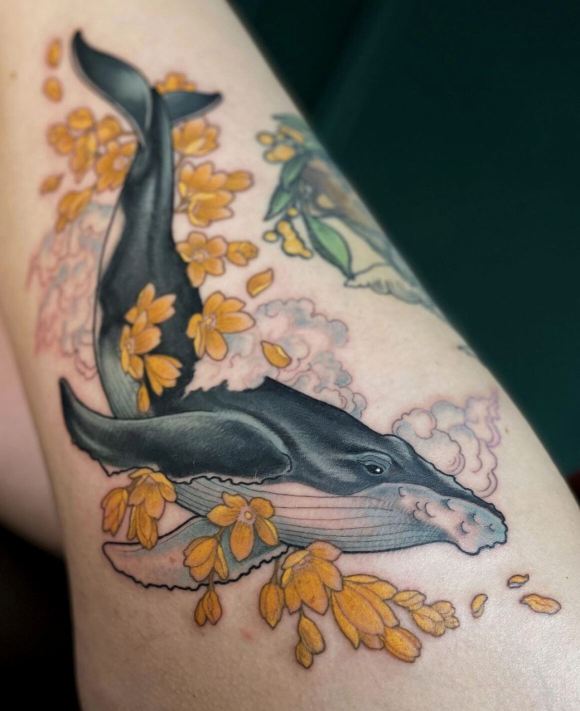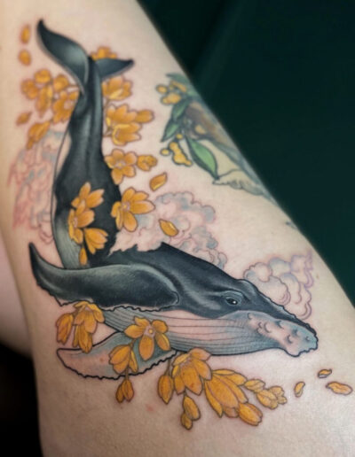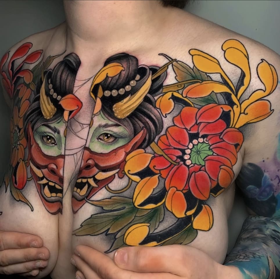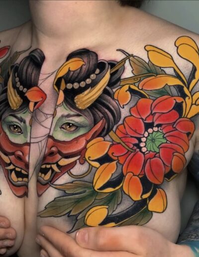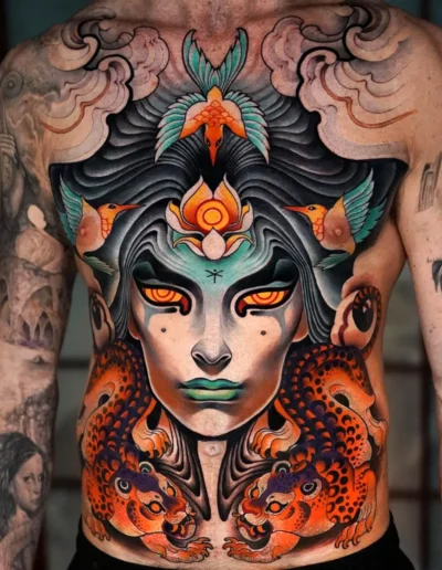 The first was the pigment revolution. By the mid-1990s, tattoo ink manufacturers were producing reliable colours that earlier generations could only approximate: mid-tone purples, clean teals, ochres, muted pinks, earth browns that held their tone rather than drifting grey. The available palette expanded substantially over two decades, and this expansion alone opened compositional possibilities that had previously been technically unavailable.