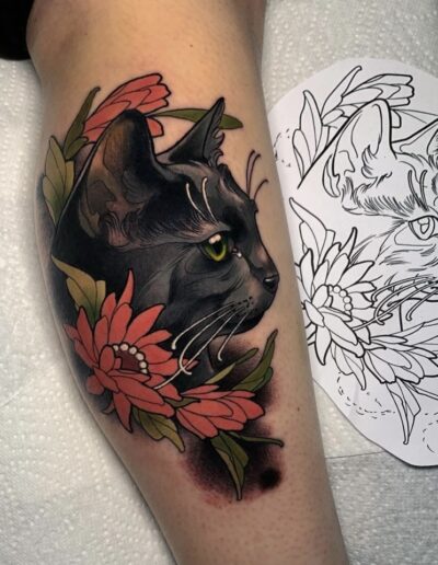 Scale matters more than in traditional work. Neo-traditional relies on internal detail — fur texture, petal gradation, ornamental framing, small botanical elements — and that detail requires real estate. A neo-traditional fox the size of a playing card will still read after ten years; the same design at the size of a coin will soften into a blob within two or three. Most experienced artists will refuse to do neo-traditional below a certain minimum size, or will simplify the design drastically if forced.