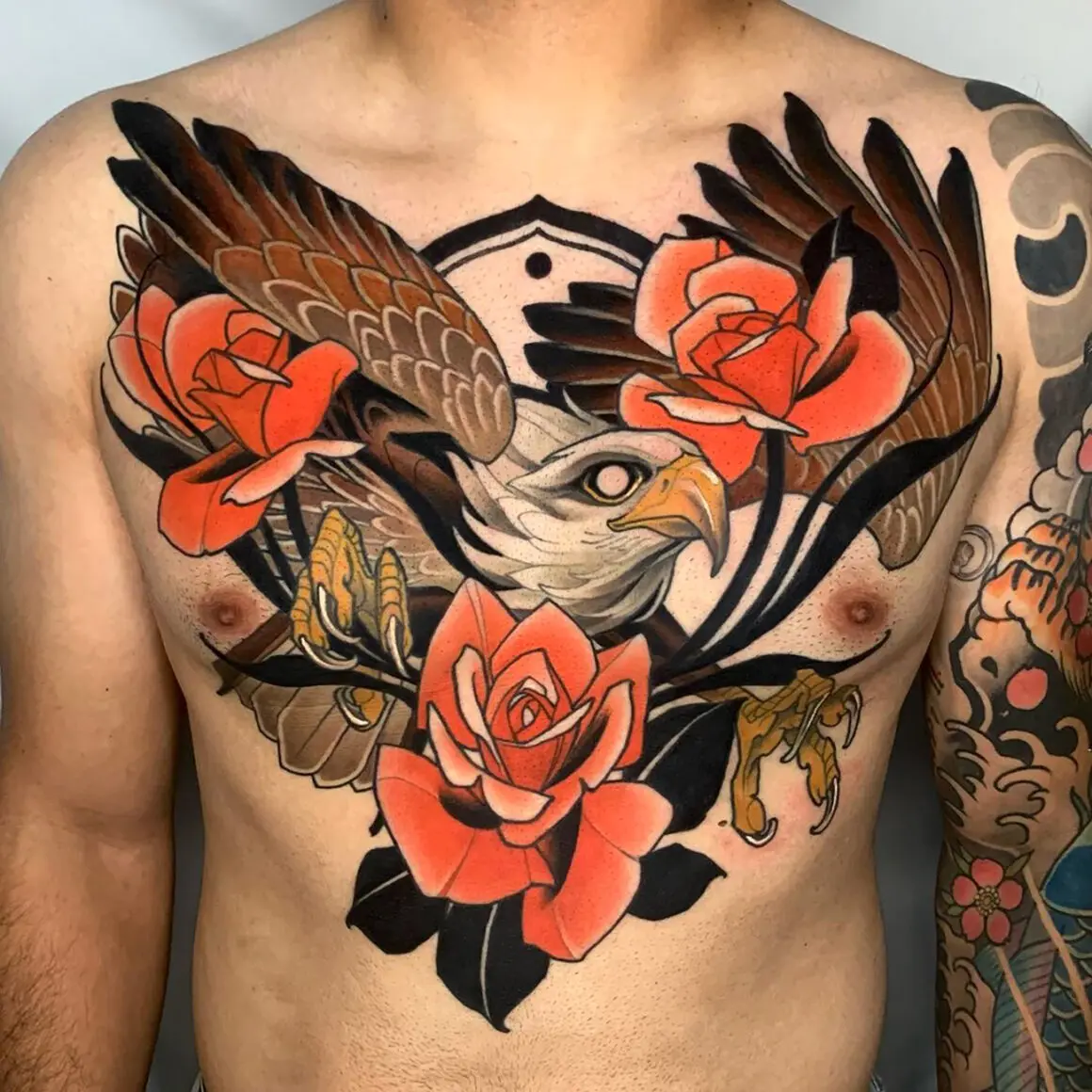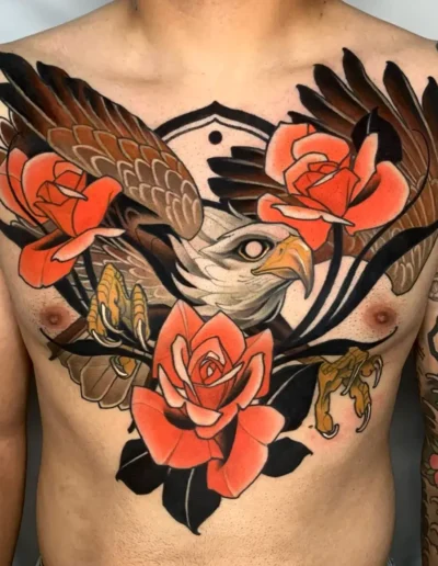 American traditional is the parent. The differences are palette, shading technique, range of imagery, and compositional density. A traditional rose has two or three flat colour tones; a neo-traditional rose has six or seven with smooth gradients, often including colours no traditional artist would have used. A traditional piece usually sits alone on skin; a neo-traditional piece usually has ornamental framing.