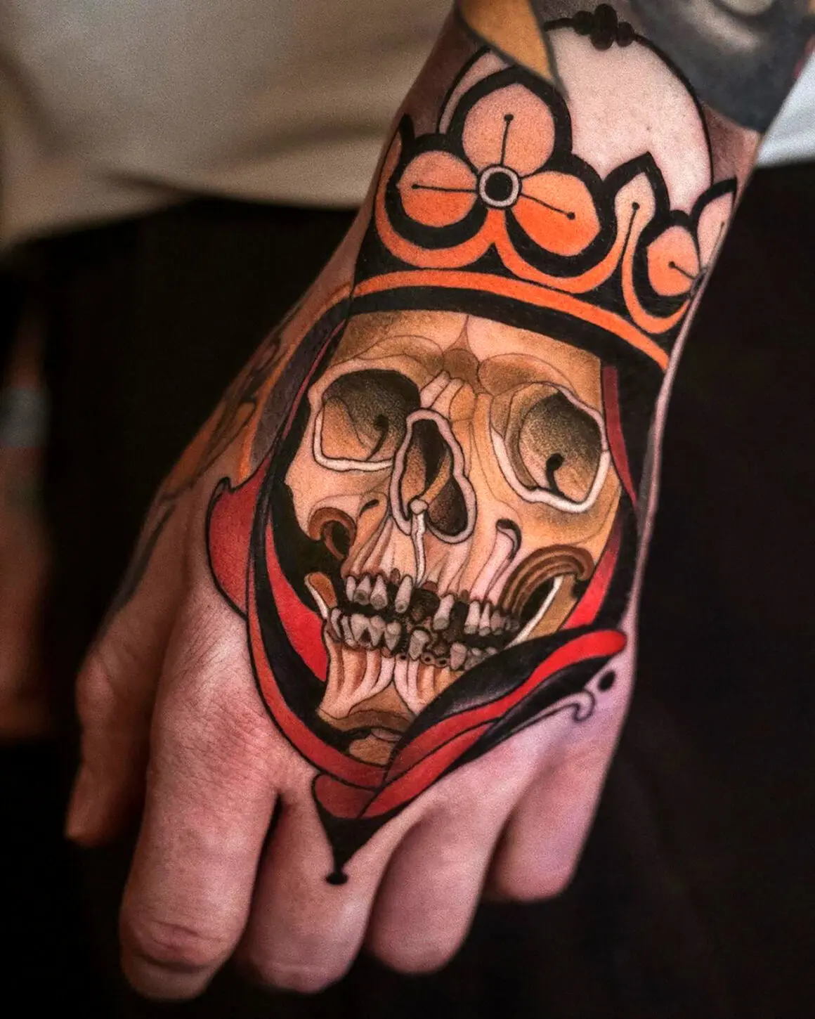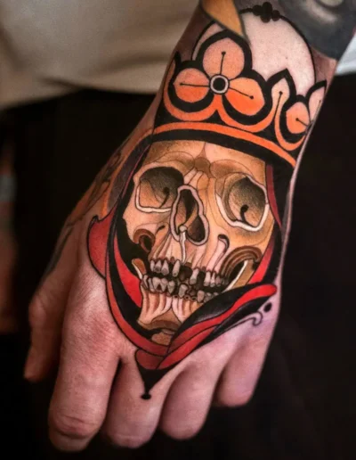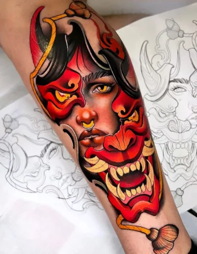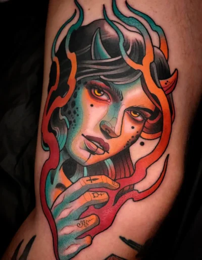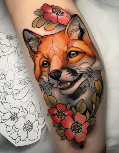 A fox with copper fur, green eyes, and a small bouquet of foxgloves between its teeth. A woman’s portrait framed by peonies, her hair rendered in fine parallel lines, her cheeks shaded in warm ochre over a pale underlayer. A stag skull draped in roses, drawn with the heavy outline of a flash design but filled in the colour range of a Dutch still life. These are the tattoos that defined neo-traditional in its first decade. The grammar is American traditional; the vocabulary has expanded into places the original tradition never went.