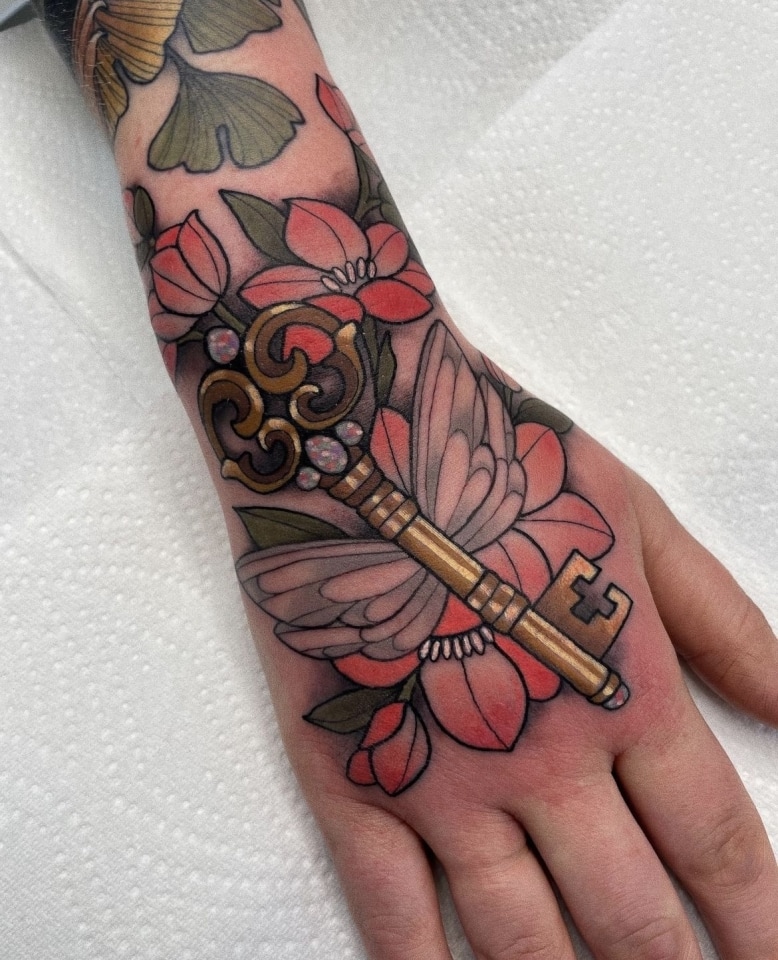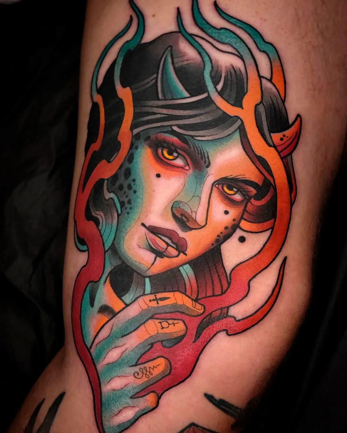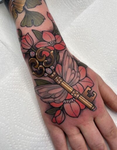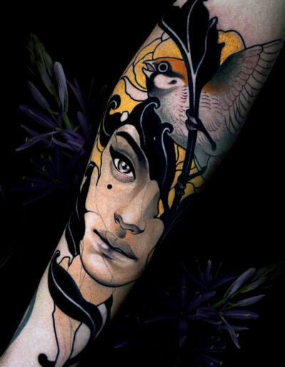 Check the palette across multiple pieces. A good neo-traditional artist develops a recognisable colour sensibility — certain combinations they return to, a consistent handling of warm versus cool tones. An artist whose portfolio looks like twenty different styles of neo-traditional is usually executing whatever reference the client brings in, rather than working from their own visual language. Both approaches exist, but the first tends to produce more coherent tattoos.