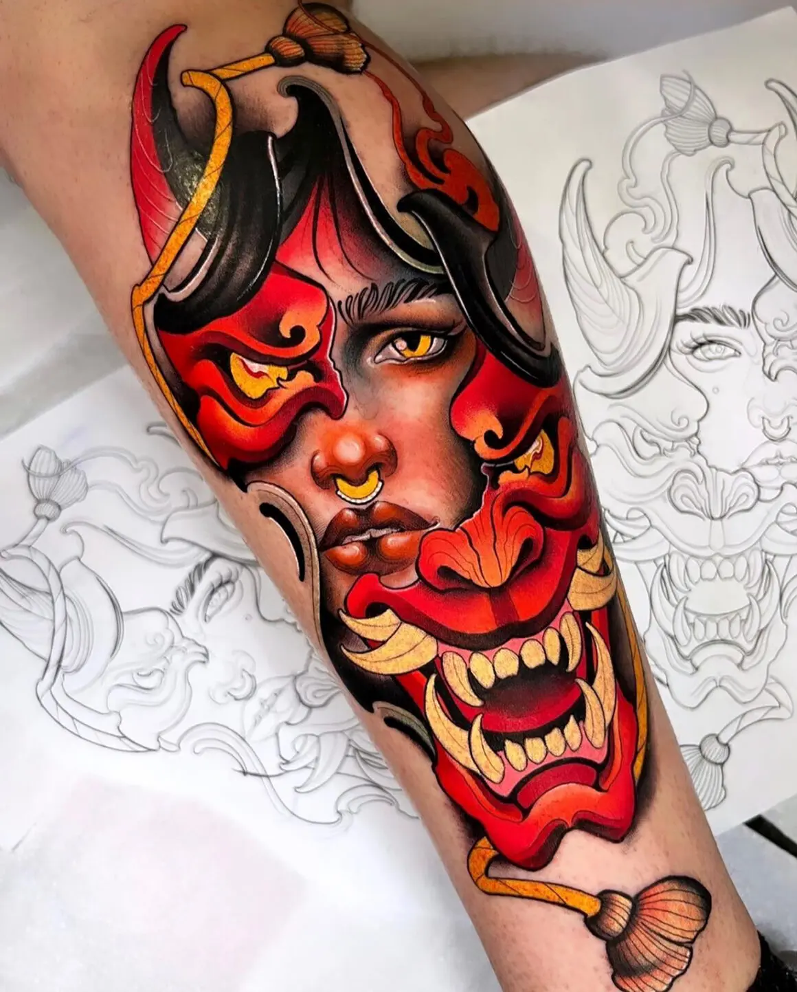 White highlights are a known risk. Neo-traditional often uses small white accents on eyes, metal, and highlight points to lift the image, and white is the first pigment to disappear. Artists who know the style well use white sparingly or replace it with a pale skin-tone tint that holds up better.